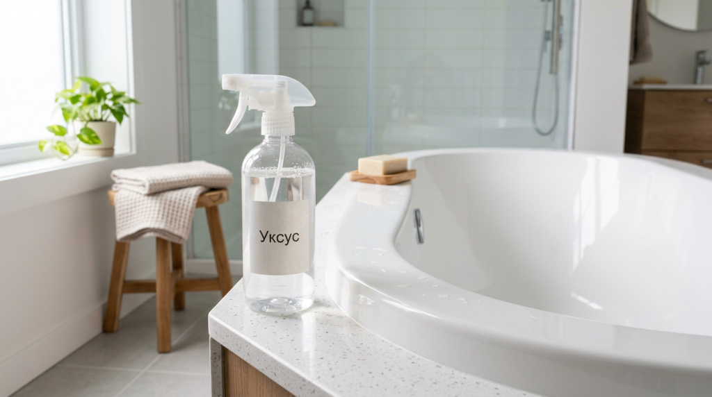Уксус 9%. Разведите с водой в пропорции 1:1, перелейте в распылитель и равномерно нанесите на поверхность. Оставьте на 15–20 минут, затем смойте и протрите насухо. Если налёт застарелый — наберите ванну тёплой водой, добавьте 500–700 мл уксуса и оставьте на 8–12 часов. Утром слейте воду и ополосните поверхность.